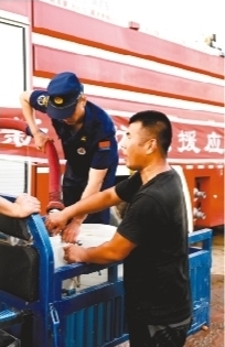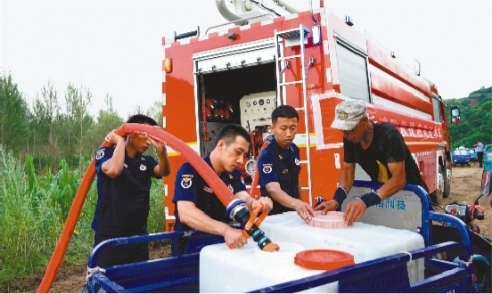 7月30日,消防车变送水车,两辆大吨位水罐车以及10名消防救援人员,火速赶到哈桃村。每当有老人前来取水,消防员会主动上前帮忙,并将水送到留守老人和腿脚不方便的村民家中。