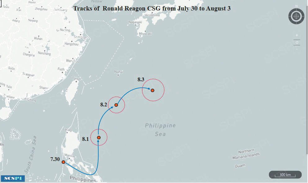 据南海战略态势感知平台推特账号的消息,8月3日,根据“灰狗”航母舰载运输机的活动轨迹判断,美国“里根”号航母打击群继续向东移动。此前,“里根”号航母被发现在巴士海峡以东海域活动。