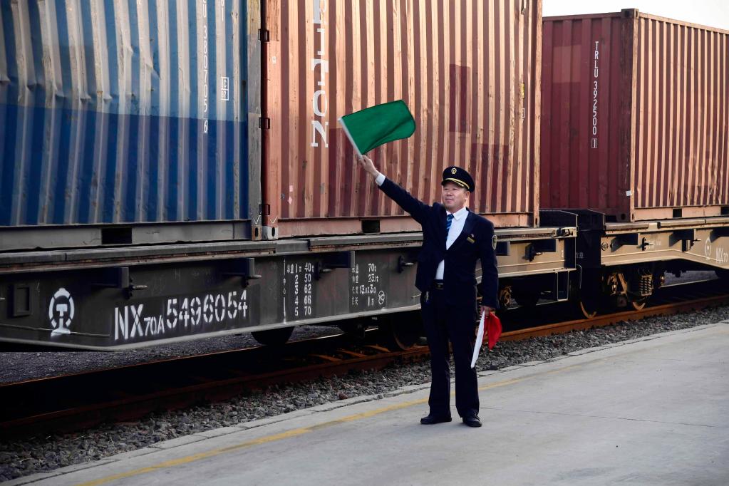 2018年5月7日,在青岛胶州湾国际物流园,中亚(青岛)国际班列在值班站长旗语指挥下缓缓开行。新华社记者 郭绪雷 摄