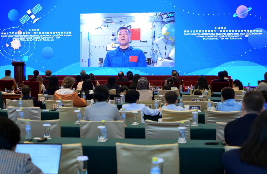 4月20日,神舟十五号航天员通过视频屏幕回答上海合作组织国家青少年的提问。新华社记者 李贺 摄