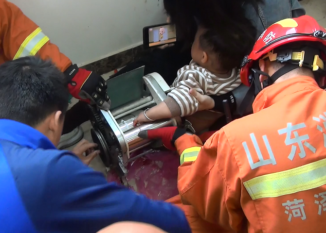 消防人员到达现场后经询问得知,家长在使用完家用小型压面机后未及时收起,1岁多儿童将其当玩具不小心把手卡进压面机,家人束手无策无法帮助孩子脱困,于是拨打119求助。消防人员仔细侦查现场情况后,决定拆卸压面机解救被困儿童。