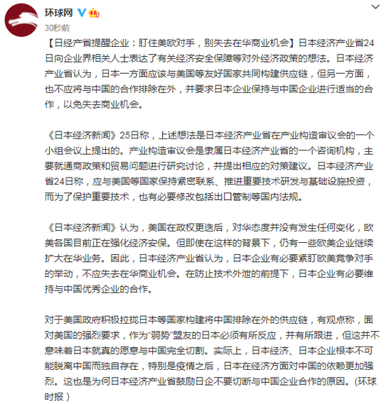《日本经济新闻》认为,美国在政权更迭后,对华态度并没有发生任何变化,欧美各国目前正在强化经济安保。但即使在这样的背景下,仍有一些欧美企业继续扩大在华业务。因此,日本经济产业省认为,日本企业有必要紧盯欧美竞争对手的举动,不应失去在华商业机会。在防止技术外泄的前提下,日本企业有必要维持与中国优秀企业的合作。